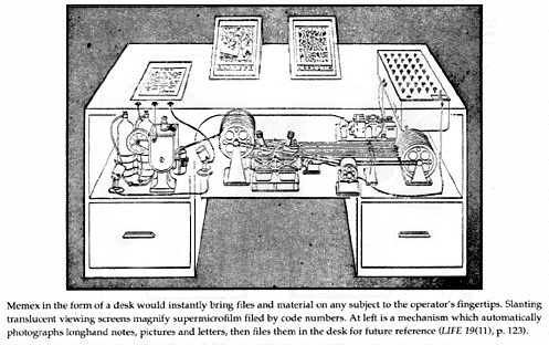 Concezione moderna (cioè digitale) di ipertesto: un dispositivo teorico impiantato in una struttura a scrivania tramite cui era possibile conservare, annotare, connettere, e leggere documenti registrati su microfilm.