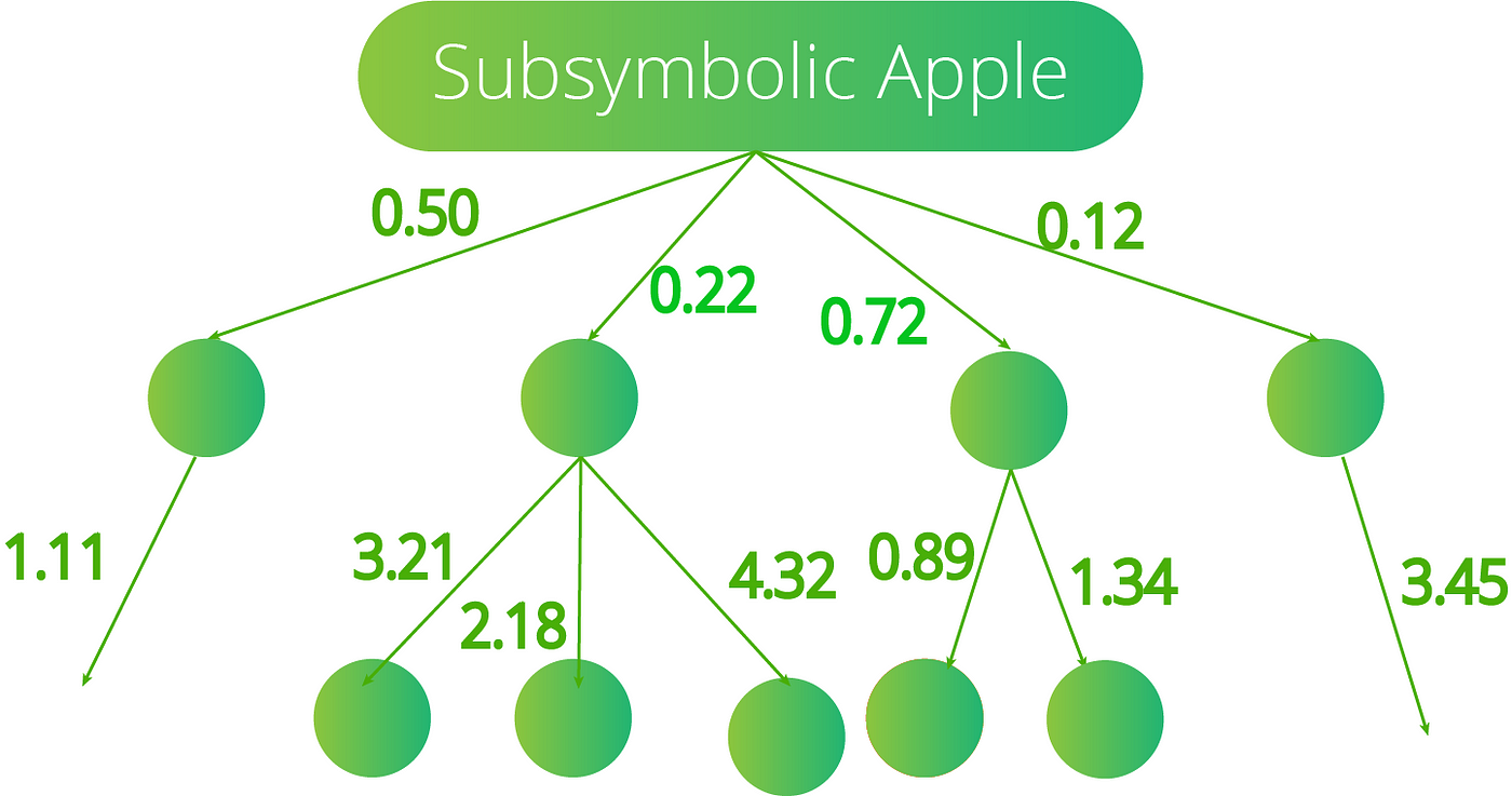 Le IA sub-simboliche non rappresentano la conoscenza con simboli visibili o comprensibili dall'uomo (come "mela", "albero", "rosso"), ma la distribuiscono attraverso le connessioni tra elementi che processano le informazioni che la costituiscono (come i neuroni in un cervello umano).