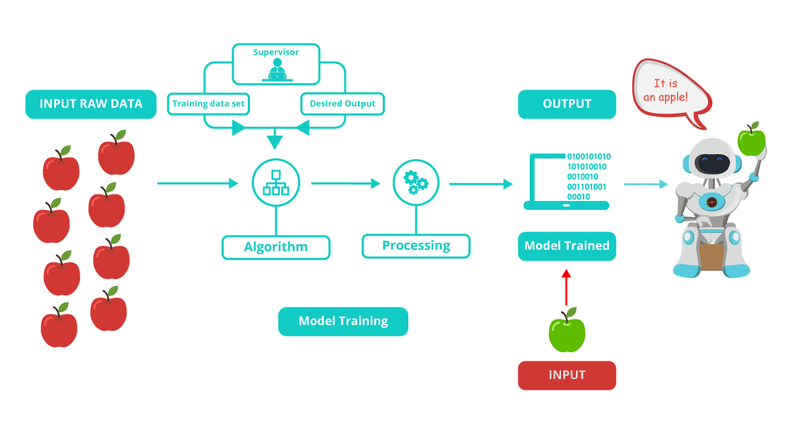 In fase di addestramento, vengono forniti i dati su cui allenarsi (es. immagini da classificare a seconda che contengano gatti oppre cani) e anche la risposta corretta (es. a tutte le immagini di cani, viene associata l’etichetta "cane"; a tutte le immagini di gatti, viene associata l’etichetta "gatto").