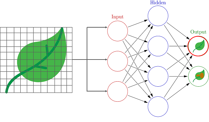 Prendiamo l'immagine di una foglia. Vogliamo capire se la foglia è sana o malata. Decidiamo di utilizzare una rete neurale.