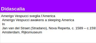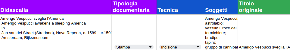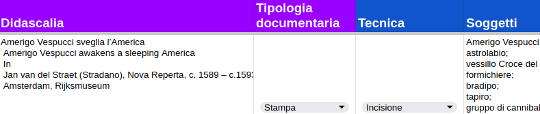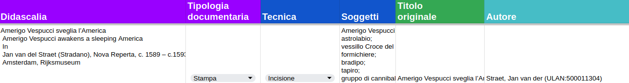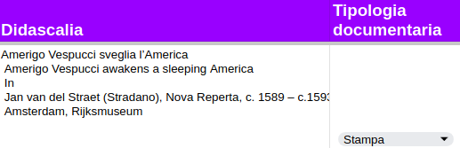 Descrizione strutturata per ogni oggetto, definita da una serie di metadati bibliografici estratti dal catalogo del museo.