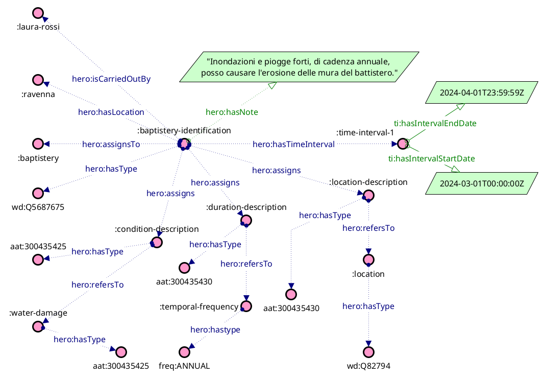Durante un'attività di identificazione dei rischi relativi al Battistero degli Ariani, condotta a Ravenna da Laura Rossi tra l'1 marzo e l'1 aprile 2024, viene identificato quanto segue: "Inondazioni e piogge forti, di cadenza annuale, posso causare l'erosione delle mura del battistero".