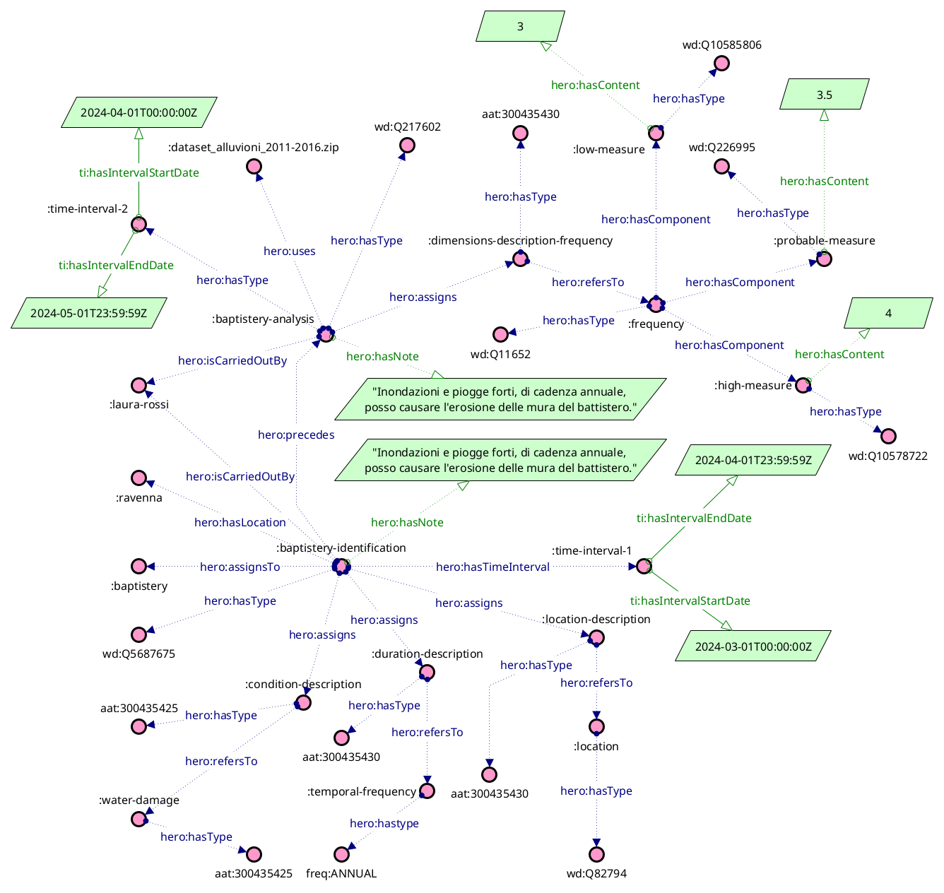 Durante un'attività di analisi dei rischi che interessano il Battistero degli Ariani, condotta tra l'1 aprile e l'1 maggio, Laura individua quanto segue: "Un evento di alluvione è previsto nel battistero circa una volta ogni 25 anni, colpendo molto probabilmente l'intero valore del patrimonio per evento, con conseguente perdita parziale". Per trarre queste conclusioni, Laura usa come fonte il dataset "dati_alluvione_2011-2016.zip", e assegna una serie di punteggi che determinano il calcolo del rischio.