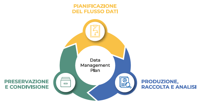 Azioni principali: identificare i tipi di dati, identificare i metadati, pianificare la loro organizzazione in dataset, e redigere un Data Management Plan (DMP).