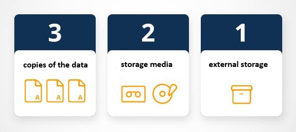 Conserva almeno tre (3) copie dei tuoi dati, archiviando le copie di backup su due (2) supporti di archiviazione differenti (es. computer, chiavetta, ecc.), con una (1) di esse situata su un servizio esterno (es. OneDrive, GitHub, ecc.).