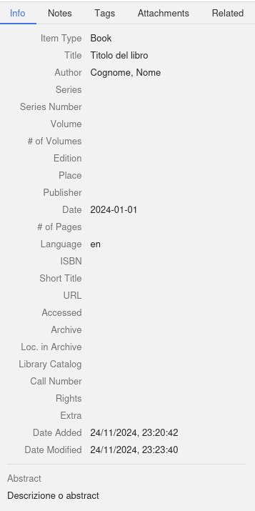 Per ora limitiamoci a inserire informazioni legate a tipo, titolo, autore, traduttore, titolo dell’opera, luogo di pubblicazione, publisher, data di pubblicazione, e info extra (che conterrà la citazione canonica originale);